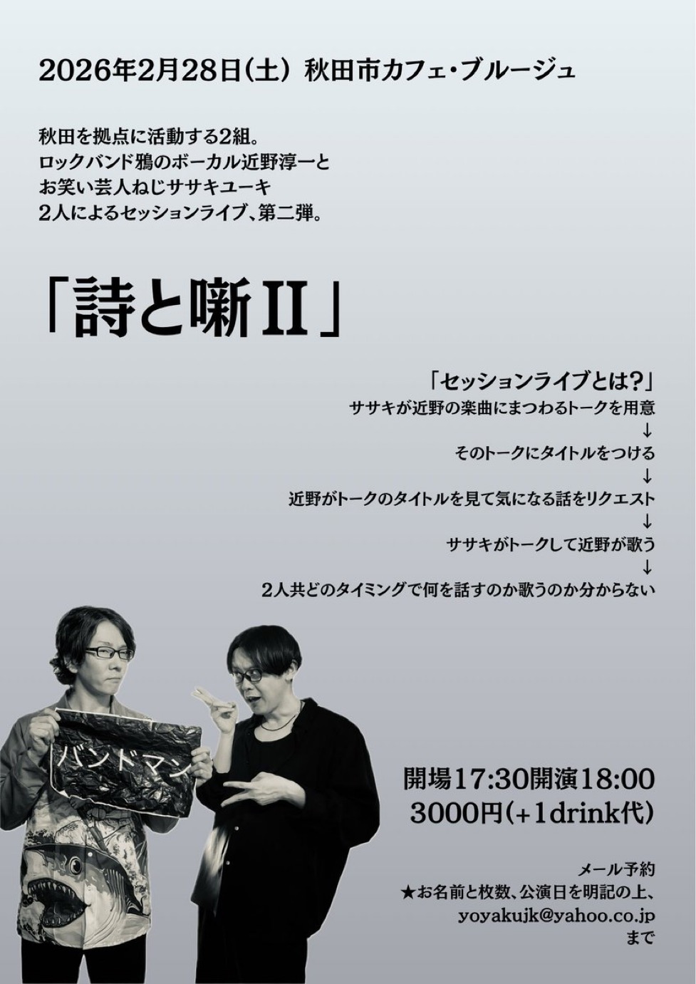 メール予約 お名前と枚数、公演日を明記の上、yoyakujk@yahoo.co.jp までメールしてください